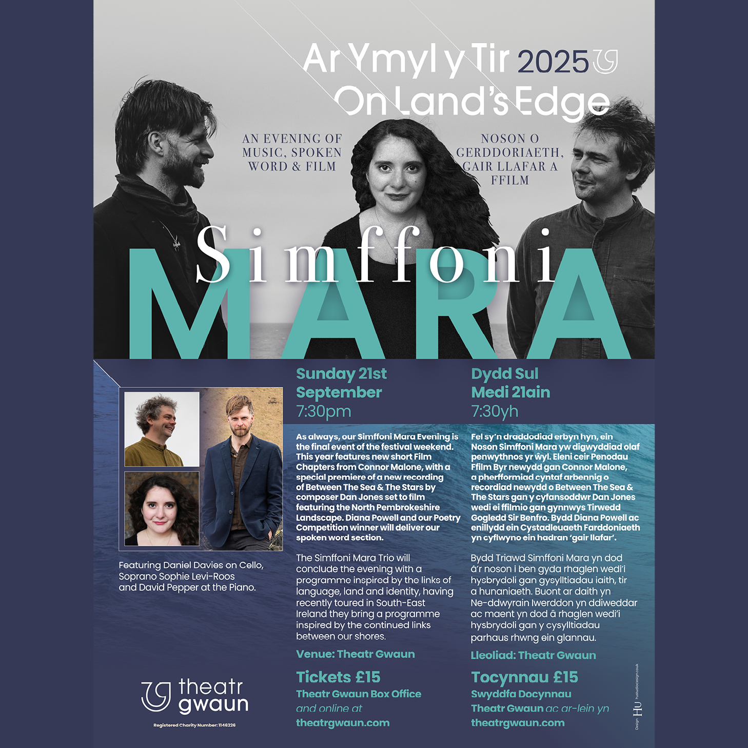 Fel sy’n draddodiad erbyn hyn, ein Noson Simffoni Mara yw digwyddiad olaf penwythnos yr ŵyl. Eleni ceir Penodau Ffilm Byr newydd gan Connor Malone, a pherfformiad cyntaf arbennig o recordiad newydd o Between The Sea & The Stars gan y cyfansoddwr Dan Jones wedi ei ffilmio gan gynnwys Tirwedd Gogledd Sir Benfro. Bydd Diana Powell ac enillydd ein Cystadleuaeth Farddoniaeth yn cyflwyno ein hadran ‘gair llafar’.